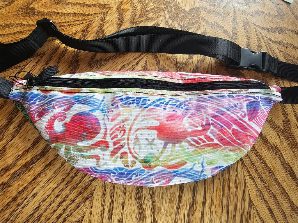 Fanny Pack with swirly colors and fun sea creatures, crab, fish, jellies, and octopus to name a few.