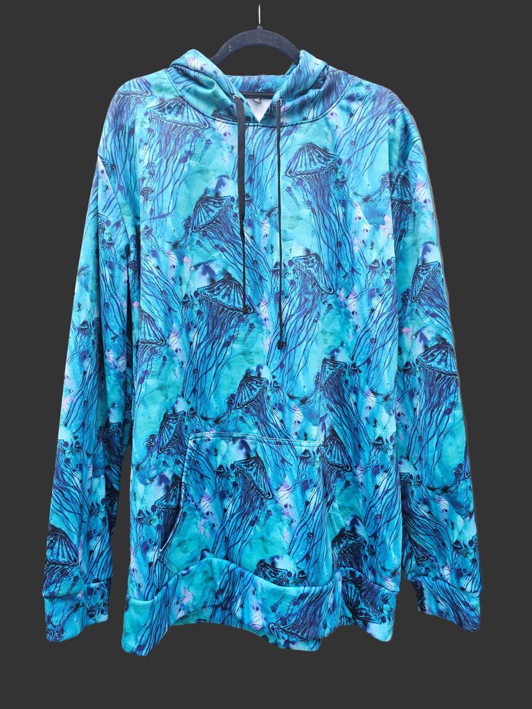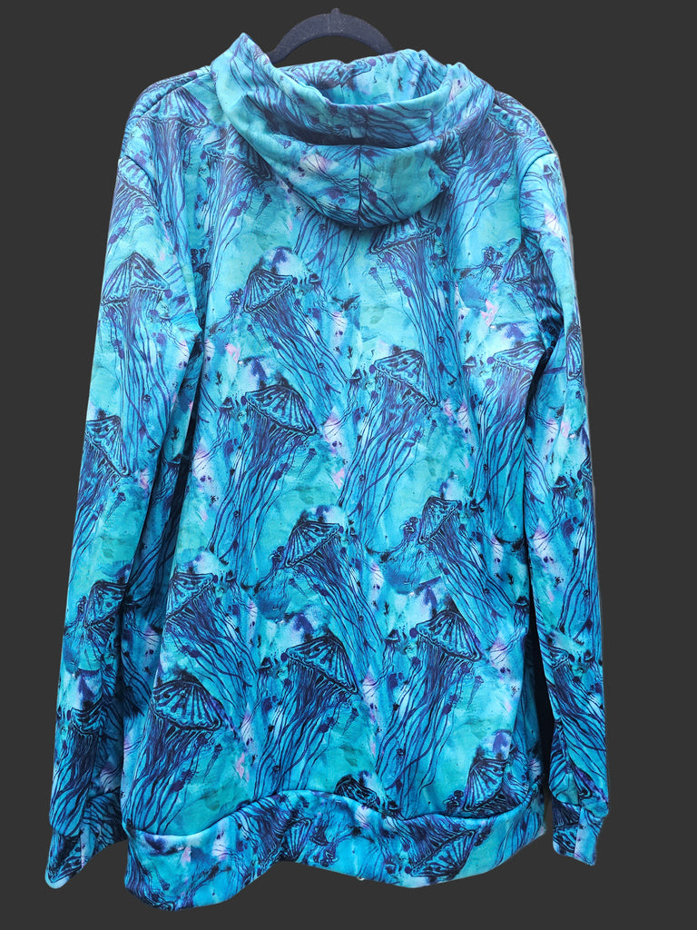 Very similar to our original hoodie fit but  approximately 3 additional inches longer in the sleeves and torso.